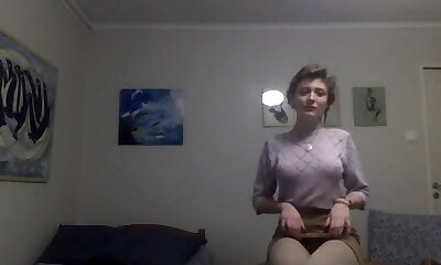 Chubby BBW brunette shows us her ass in high high-heeled slippers.