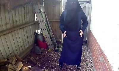 Niqab Fuckslut! Fette Moslemnutte strippt im Hinterhof!